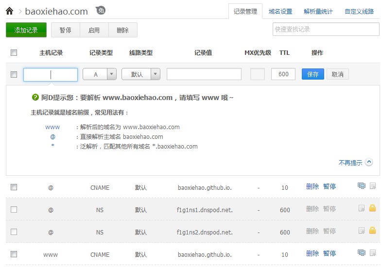 [4] 回到DNSpod,点击在Godaddy注册的个人域名,添加2个记录,其主机记录分别是@和www(这样个人域名前有没有加www应该都可以访问到),记录类型选择CNAME,记录值都选择下一个步骤在Github上创建的Github Pages链接地址(博主Github Pages)。