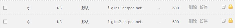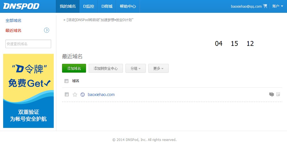[2] 进入DNSpod首页(注册登录)后点击“添加域名”,记录生成的2个DNS服务器。
