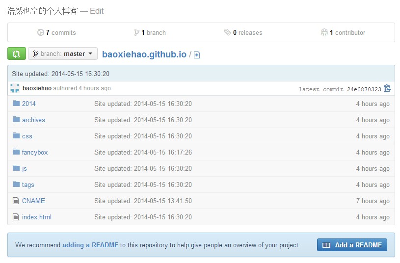 [6] Github Pages项目创建完成后,需要在项目中新建一个CNAME的文件,文件内容是刚刚在Godaddy注册的个人域名地址。方便起见可以在项目详情右下角点击Add a README,然后修改文件名称和文件内容,最后在右下角点击Commit new file即可。