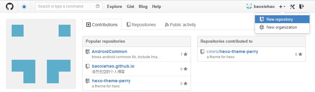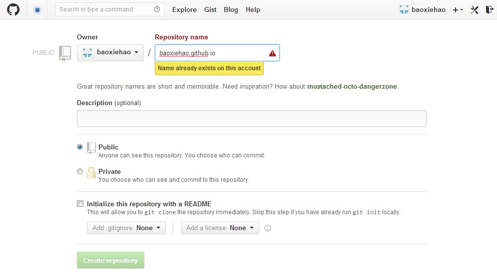 [5] 进入Github首页(注册登录),在右上角+处选择New Repository新建Github Pages对应的仓库项目,项目名称一定是要和Github的个人账户名字相同!输入完成后,点击Create Repository完成创建(博主是因为已经创建过了所以提示已经存在)。