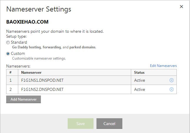 [3] 重新登录Godaddy,在Domain页面Launch刚刚注册的域名地址,然后添加刚刚在DNSpod生成的2个DNS服务器。